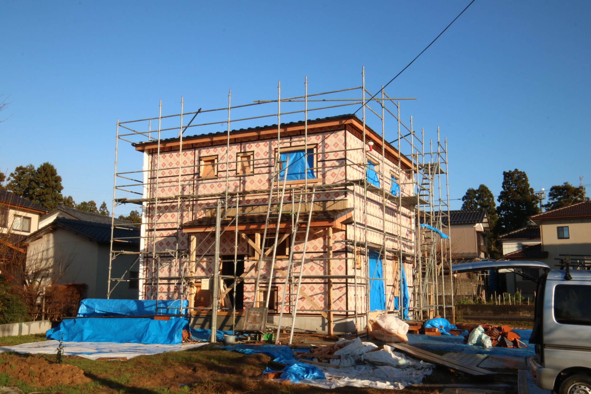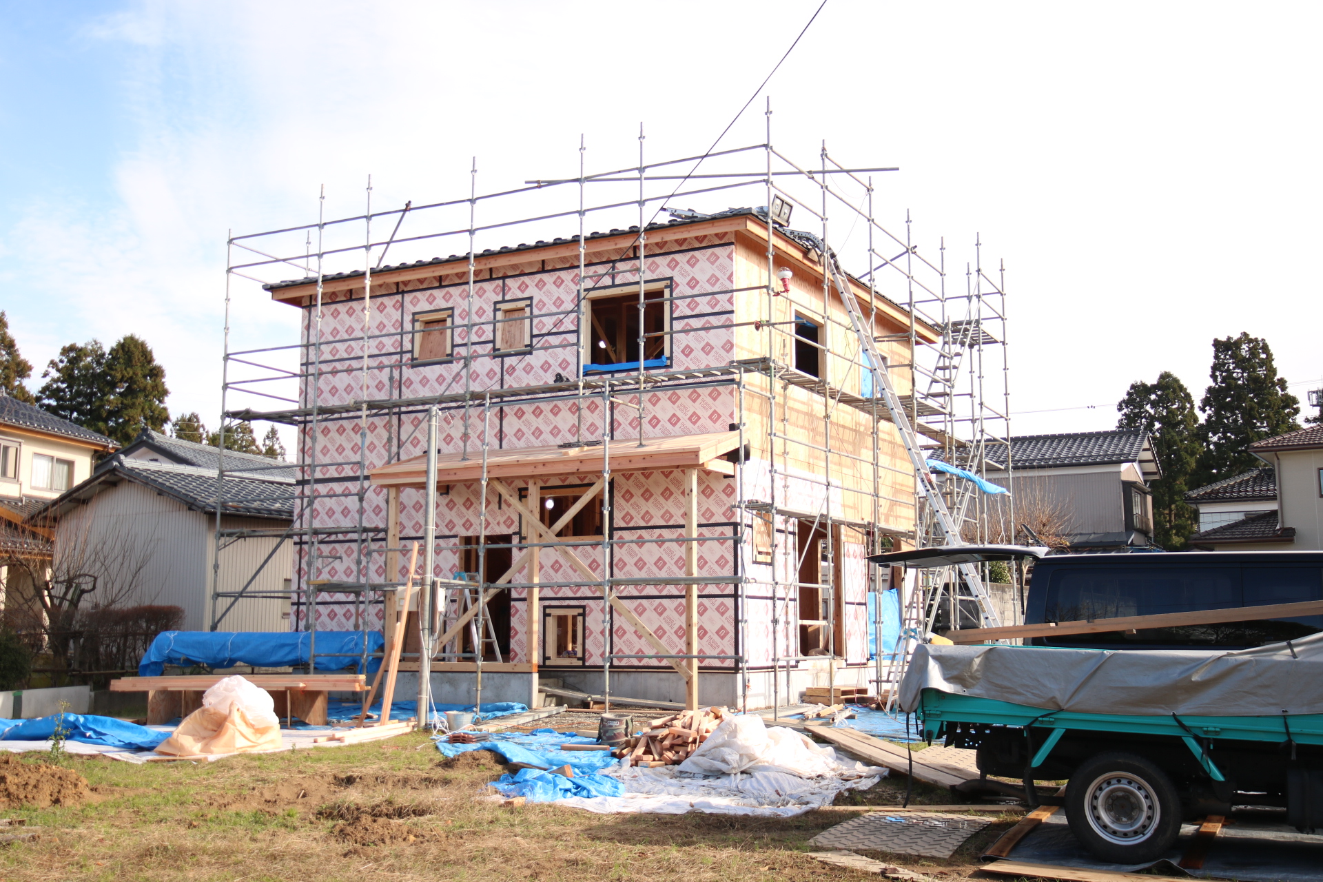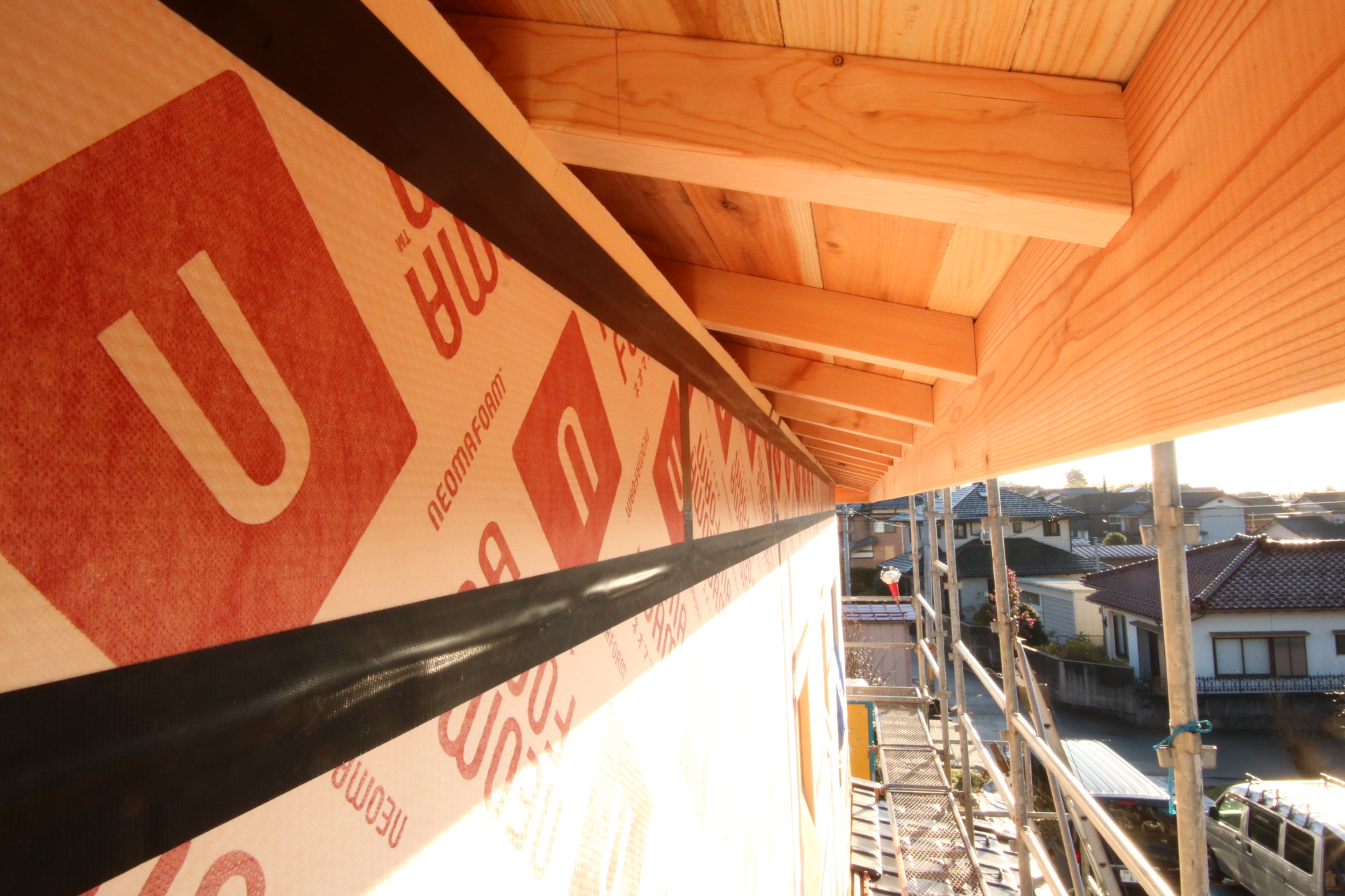 この時期の外部は天気との戦いでもありますが、ここまでの全ての工程で水気・湿気を排除しながら進めてこれてたいへん気分が良いです!!(←工期にある程度の余分をみておかないとやり繰りできない状況になります。材が濡れたままどんどん進めて行かざるを得ない状況になっちゃいます。)