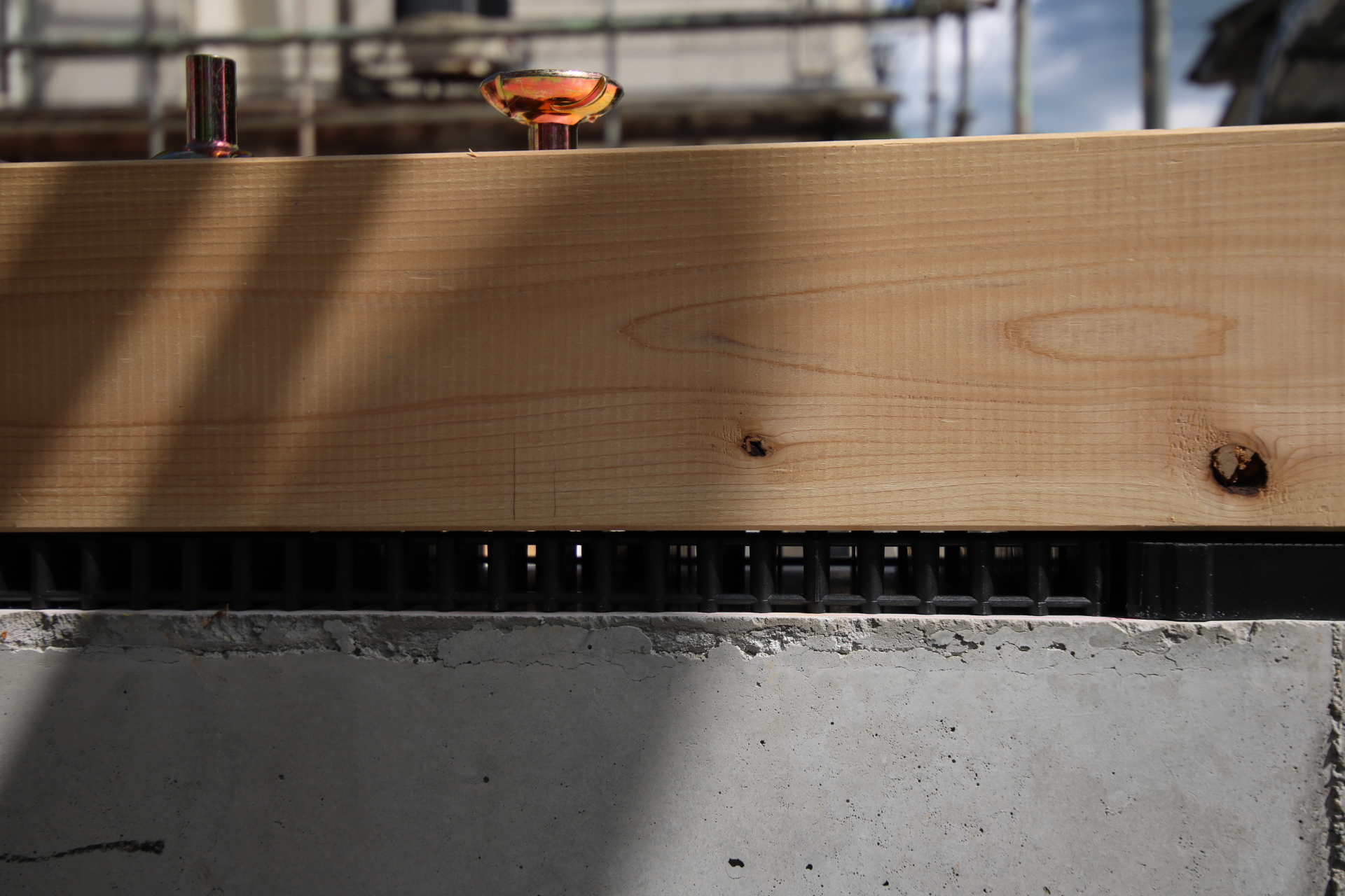 次。川見建築ではこのタイミングで土台外周部に防鼠材を打ちます。(土台設置後、大引を入れる前が理想)