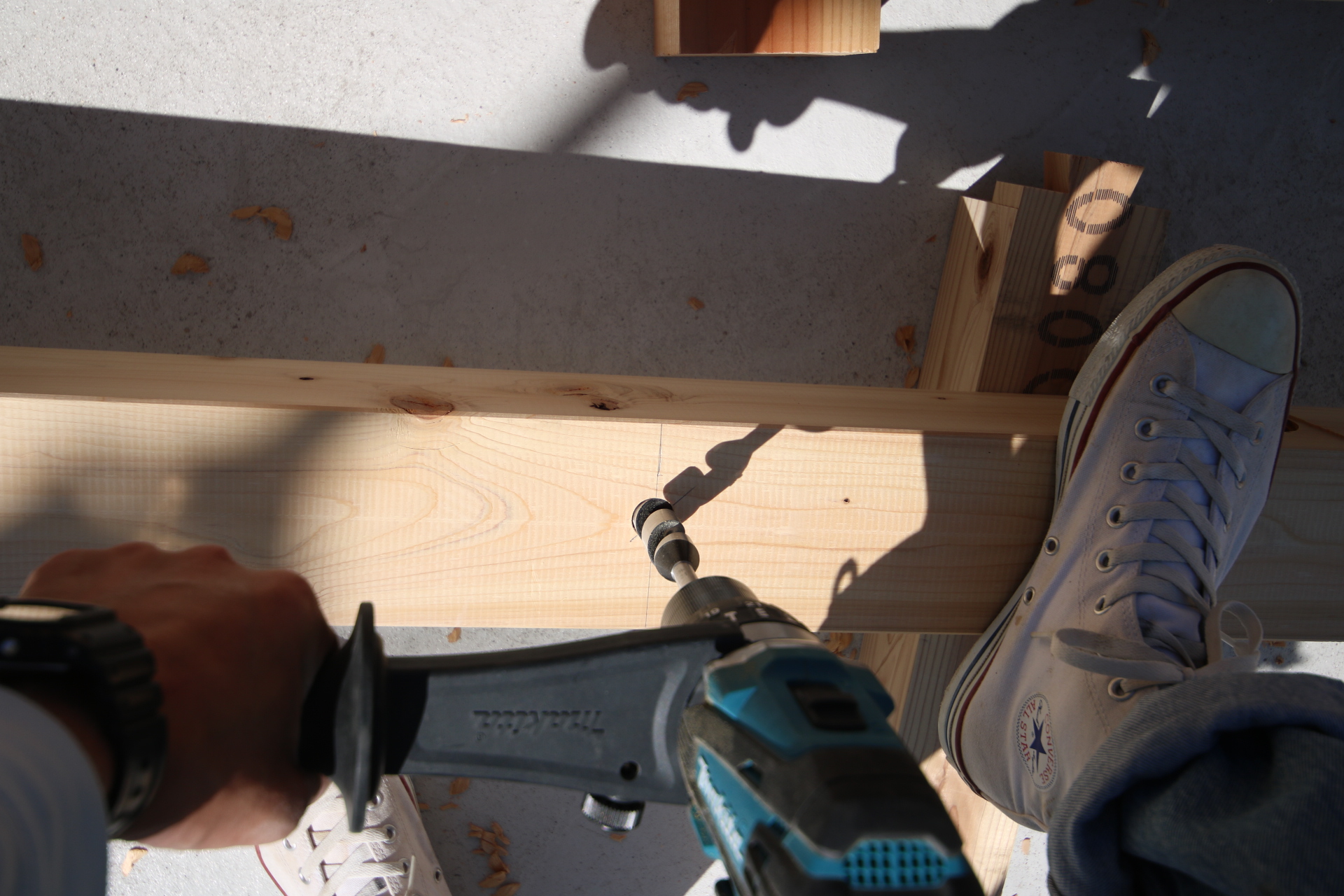 次に穴あけ。アンカーボルトの位置を拾って、間違えないように穴を開けます。充電式ドリルを導入して、ストレス無く効率よく穴あけできるようになりました。電源コードはとにかくわずらわしい。引っかかったりコンセントが抜けたり。キリさえ切れれば充電式でもバンバン穴が開けれます。