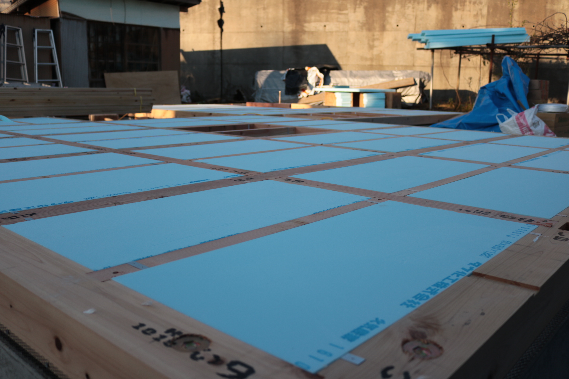 次。床合板を留めて、養生のビニールシートを貼って無事に本日終了です。日中は9月後半のわりに暑かった反面、秋を感じる陽の短さで6時すぎにはうす暗くなってきました。